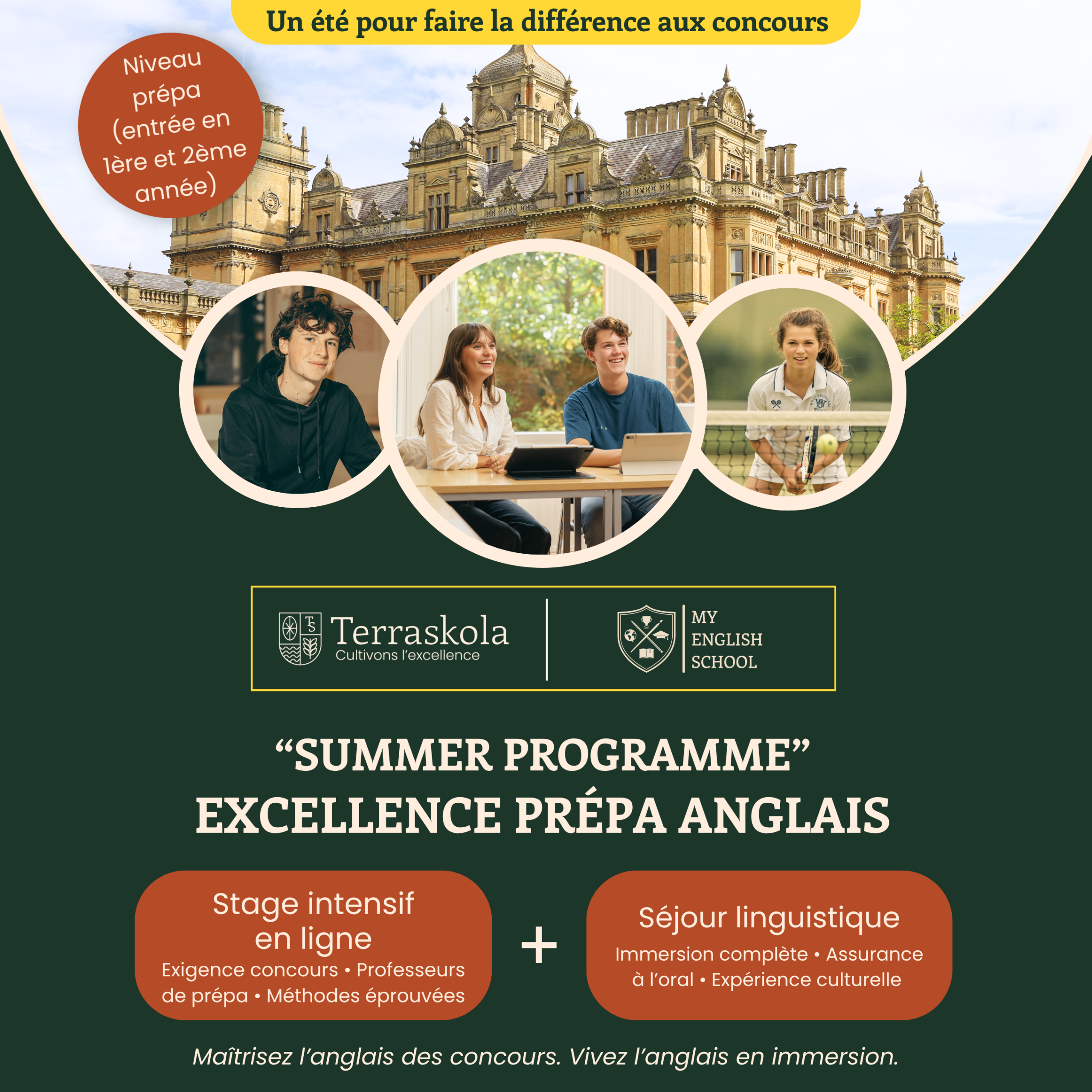 Terraskola, institut de préparation aux grandes écoles, et My English School, organisme de séjours linguistiques et de scolarités à l’étranger, s’allient pour vous proposer un programme d’excellence pour élever efficacement votre niveau d’anglais :